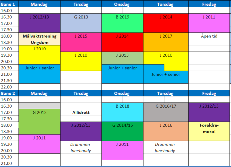 Se oppdatert oversikt på treningstider og kamper via denne lenken: Banekalender Berskaughallen